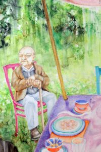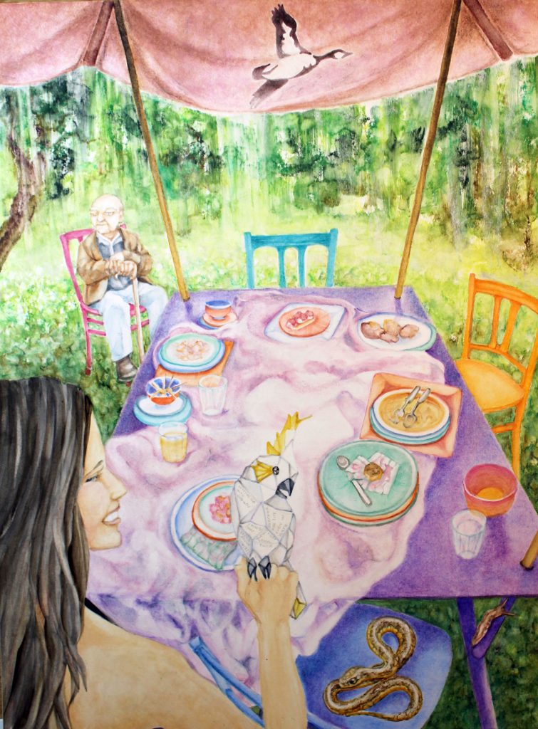In this dream, neither the old man nor the young woman are actually in the elements that surround them, nor are they relating to each other. Certainly most of us prefer a picnic under an awning on a rainy day, yet how powerful it is to just be in the weather, without complaint or control.