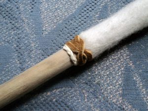 Even my most simple design for a drumstick has undergone an apparently magical transformation. At least I think white wool is transformative, since I found some in my wool-from-Cortes-box. I mean, who has sheep this white?