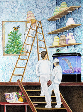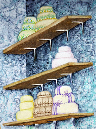 Serving oneself a wedding cake is a metaphor for a high degree of self-focus. But a closer look at the full image shows that there is no place to have lifted the cake from, and no way to reach a shelf to store it.